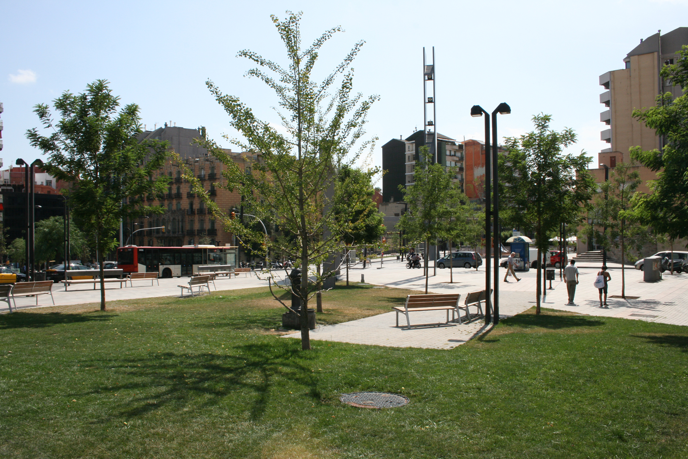 Algunas fotos de la plaza de Lesseps. Arbol sujeto para que no caiga, la entrada de la Biblioteca Jaume Fuster…